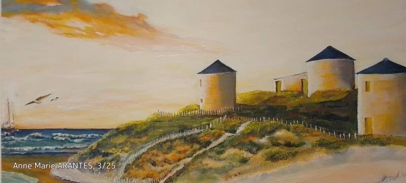 "Moinhos da Apúlia", Peinture acrylique, toile coton sur châssis 50*40 cm, 2024. Les contours de la toile sont peints. Réalisée pour une commande et réalisable sur commande. Non disponible.