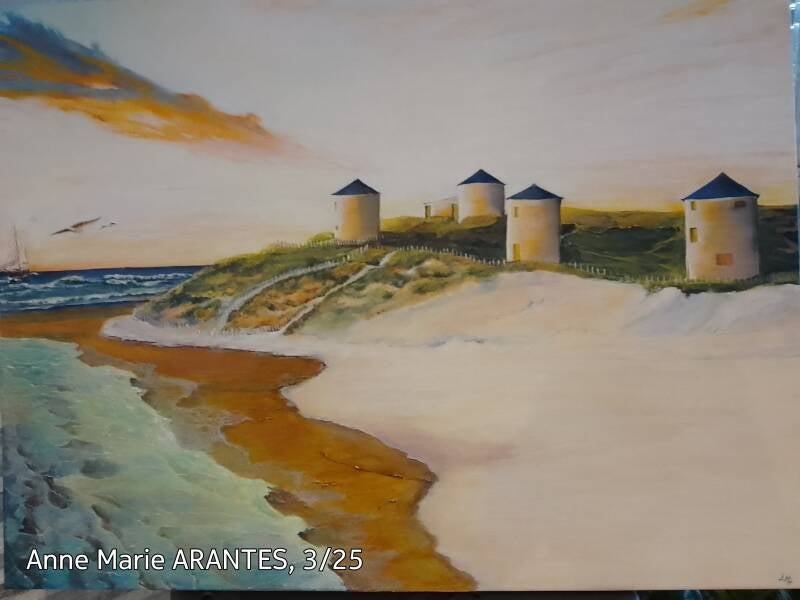 "Les Moulins d'Apúlia", Peinture acrylique, toile coton sur châssis 100*75 cm, 3-2025. Les contours de la toile sont peints.