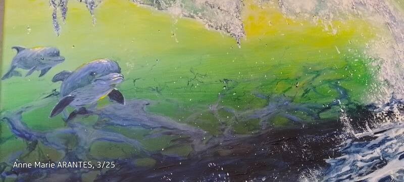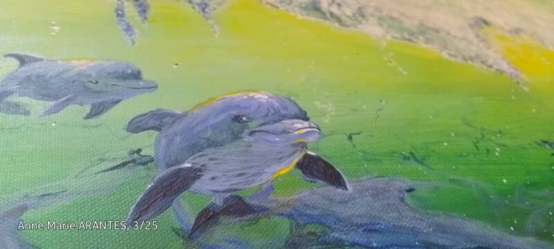 "Nager avec les dauphins", Peinture acrylique, toile coton sur châssis 45x55 cm, 5-2025. Les contours de la toile sont peints.